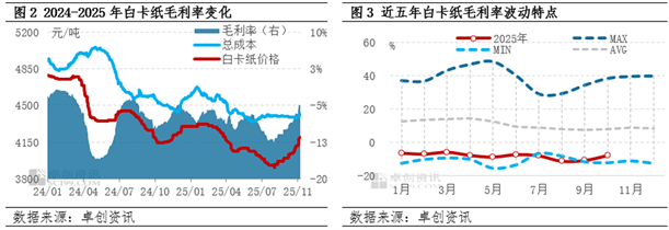 自9月开始,白卡纸市场开启下半年的上涨行情,但由于纸价整体涨幅有限,与理论生产成本仍处于倒挂状态。从2024-2025年白卡纸毛利率变化图可以看出,随着纸价陆续上涨,9-11月毛利率整体回升,但仍处于近五年底部水平。根据进口原料木浆价格测算,11月14日白卡纸毛利率为-5.32%,行业整体仍处于亏损状态。对于拥有自产浆线的纸厂而言,企业具有成本优势,但亦尚处于微利状态。因此生产企业拉涨积极性较高,成为推动市场价格上行的关键因素。