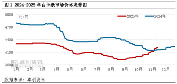 【导语】11月白卡纸市场持续上涨,由于行业盈利承压,且纸厂库存低位,企业拉涨态度明确,对市场走势形成向上驱动影响。11月中下旬至12月,纸厂将以改善盈利为目标,纸价或继续拉涨,在高位成本以及订单好转等因素支撑下,预计市场走势或整体维持上涨趋势。